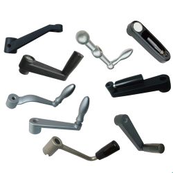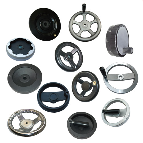各式手輪把手,款式有碟型、電木碟型、二叉塑膠手輪、塑膠手輪、滾花手輪、沖壓沖壓成型鐵手輪、電木三幅手輪等。